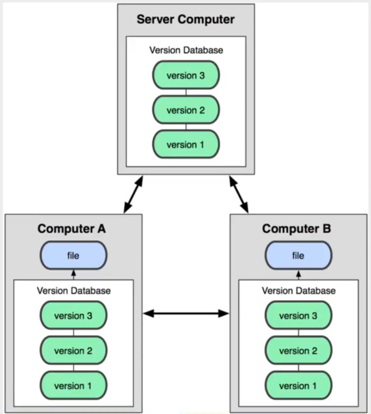 所有版本信息仓库全部同步到本地的每个用户,这样就可以在本地查看所有版本历史,可以离线在本地提交,只需在连网时push到相应的服务器或其他用户那里。由于每个用户那里保存的都是所有的版本数据,只要有一个用户的设备没有问题就可以恢复所有的数据,但这增加了本地存储空间的占用。