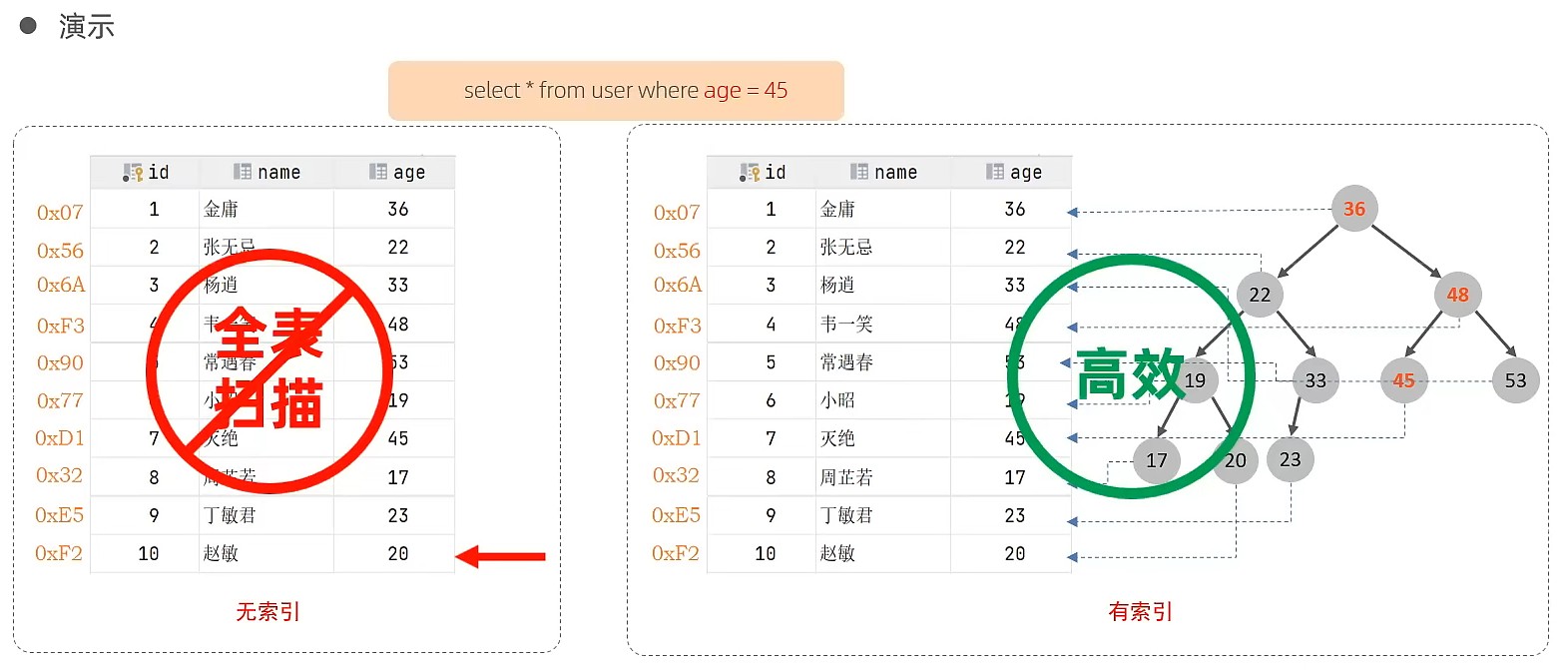 简介:索引是帮助mysql高效获取数据的数据结构(有序)。在数据之外,数据库系统还维护这满足特定查找的数据结构,这些数据结构以某种方式引用(指向)数据,这样就可以在这些数据结构上实现高级查找算法,这种数据结构就是索引。