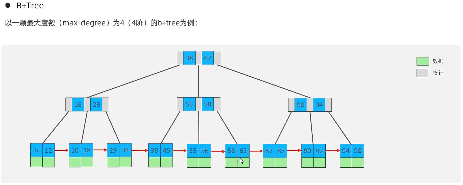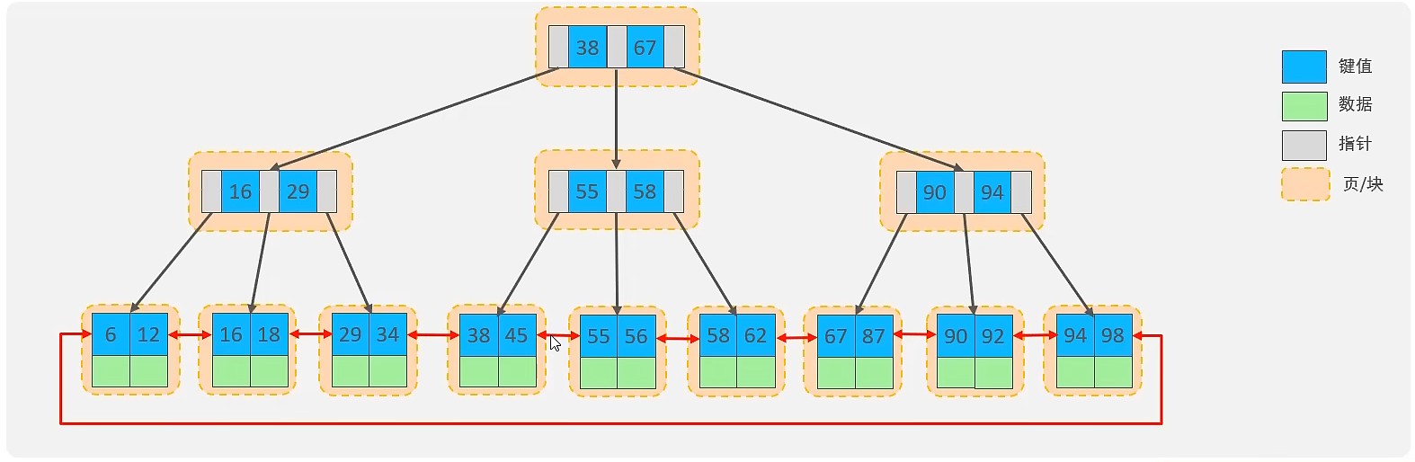 MySQL索引数据结构对经典的B+Tree进行了优化。在原B+Tree的基础上,增加一个指向相邻叶子节点的连表指针,就形成了带有顺序指针的B+Tree,提高区间访问的性能。