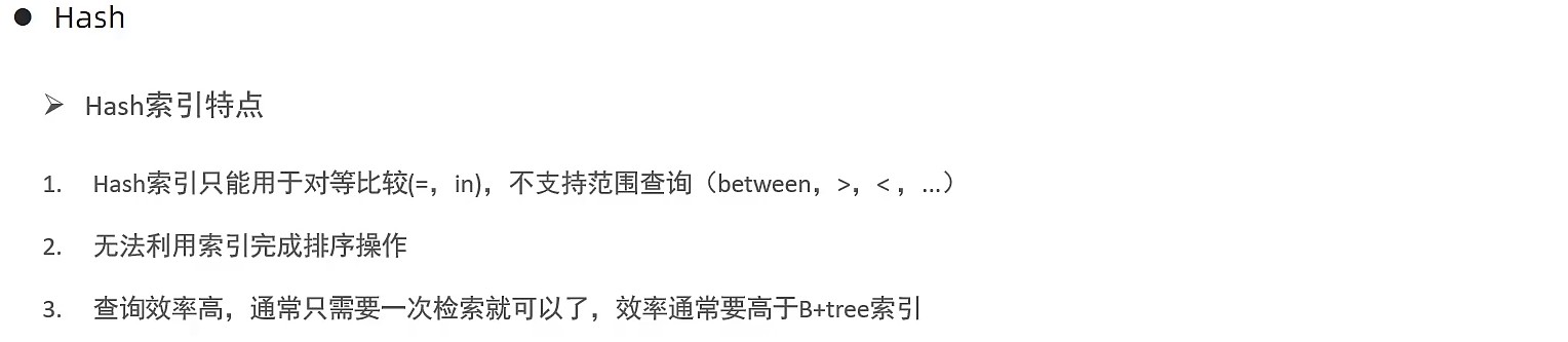 | Hash索引 | 底层数据结构是用哈希表实现的,只有精确匹配索引列的查询才有效,不支持范围查询 |