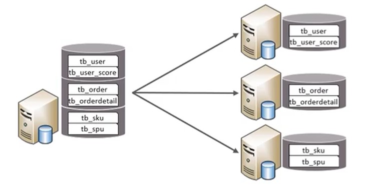 以表为依据,根据业务将不同表拆分到不同库中。特点: