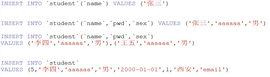 语句:insert into 表名([字段名1,字段2,字段3]) values(‘值1’,’值2’,’值3’,…..)